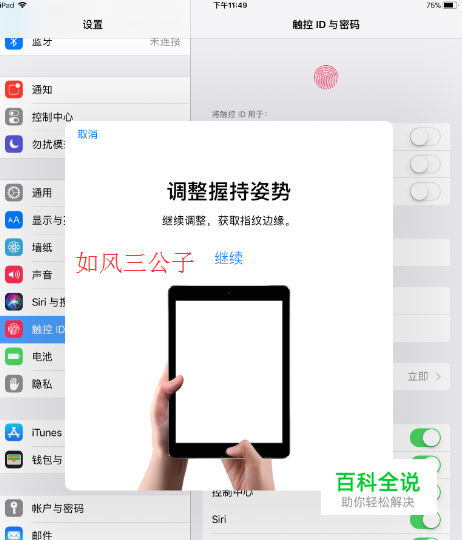 ipad为了能够全面覆盖用户那只手指的指纹,会弹出调整握持姿势的提示,之后用户只要根据相关的提示进行操作即可。