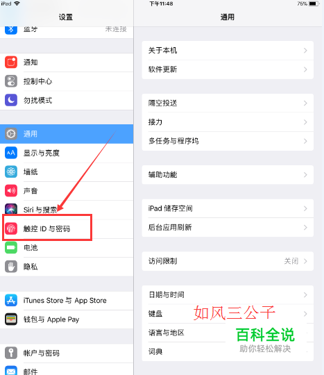 进入到ipad的设置页面后,接着再点击“触控ID与密码“按键。