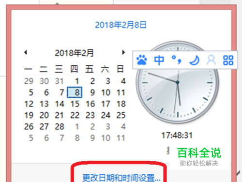 在笔记本电脑的右下角是显示日期和时间的地方。点击日期和时间,系统会弹出显示时间和日期的选项卡,在选项卡的中部点击“更改日期和时间设置”。