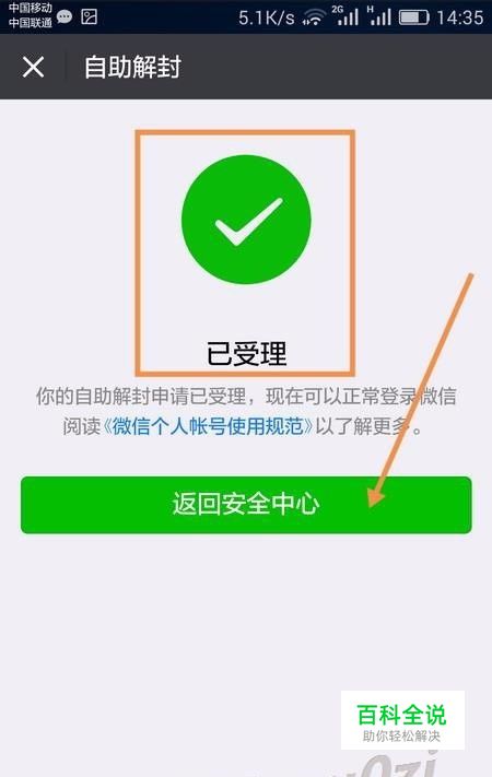 这时在自己手机的微信中,就可以看到自助解封已受理的提示,现在帐号就恢复正常了. 返回安全中心,开始登录吧! 7:56 2016-10-04
