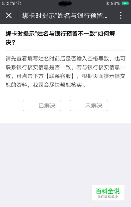 微信当中添加绑定银行卡时,会出现姓名与银行预留不一致的提示窗口。还有如何解决方法的信息提示内容。