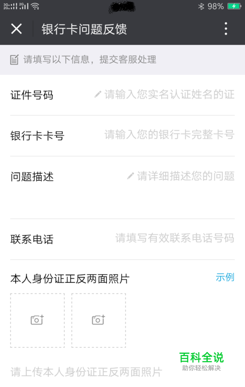 在银行卡问题反馈的窗口内.有联系电话本人身份证和相关截图内容。