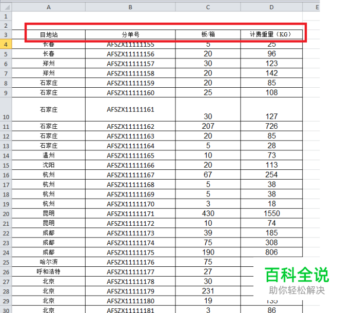 在sheet3中D2输入公式==VLOOKUP(A2&B2&C2,IF({1,0},Sheet1!A3:A41&Sheet1!C3:C36&Sheet1!D3:D54,Sheet1!B3:B33),2, 0)按CTRL+SHIFT+ENTER键结束就会显示出分单号。 查找值为 目的站&板/箱&计费重量,所以我们就把A2/B2/C2用&连接起来。 查找区域对应sheet1中的目的站&板/箱&计费重量,所以我们把查找区域也用&连接起来,就成为本公式中的Sheet1!A3:A41&Sheet1!C3:C36&Sheet1!D3:D54,结果显示为分单号一列,所以区域为Sheet1!B3:B33,因IF{1,0}把查找顺序排列为(目的站板/箱计费重量,分单号)分单号一列在第二列,所以col_index_num就填写2,range_lookup跟平常一样填写0,在这里注意写完公式后要CTRL+SHIFT+ENTER键结束就会显示出分单号。 VLOOKUP函数与column函数的配合使用:返回多个结果(在sheet4中根据分单号查找出分单号对应的板和计费重量) 在sheet4中C2输入公式=VLOOKUP($A2,Sheet1!B3:D49,COLUMN(),0) 查找数据是$A2,查找范围是sheet1中订单号和板/计费重量所在范围,column()在这里表示的是B2单元格所在的列数为2,填写完公式后回车,然后向右拉,就会看到C列出现计费重,这种方法比一次一次VLOOKUP快速。 注意如果向右拉数据显示为错误符号,需要检查公式,查找范围是否绝对引用,那么我们更新之前的公式为 =VLOOKUP($A2,Sheet1!$B$3:$D$49,COLUMN(),0)然后回车得出计费重量,CTRL+D向下填充所有的结果。
