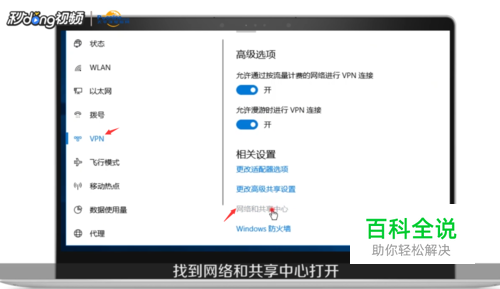 进入到网络和Internet”设置窗口后点击“VPN”,再找到并点击“网络和共享中心”