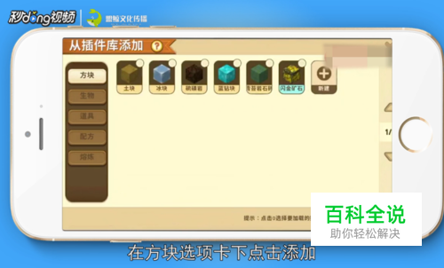 在“方块”选项卡下点击“添加”,选择“硫磺岩”。
