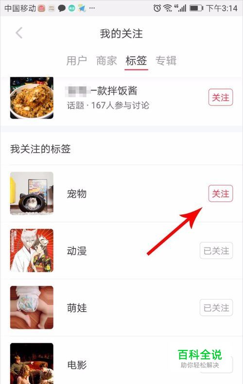 取消关注兴趣标签 1,手指点击标签后面的“已关注”,打开是否取消关注对话框 2,此时我们点击“是”便可取消关注,原来的灰色“已关注”变为红色“关注”