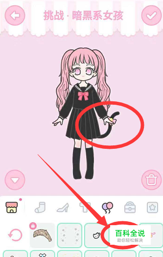 装扮少女游戏第二十六关是暗黑系女孩,这关主要是把黑色系的服装,配饰等都佩戴上。但建议是配有下图画圈中的 尾巴,因为小编曾没有选择这项,未能通关。