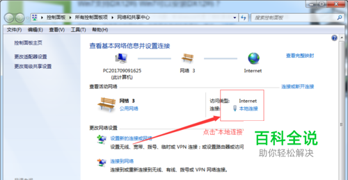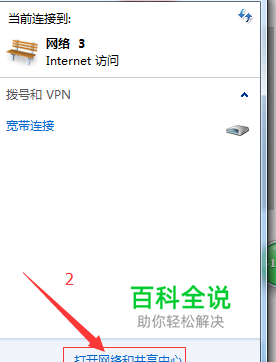 点击网络连接图标,再点击页面里的“打开网络与共享中心”。