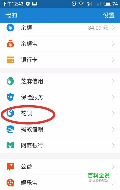 在“我的”选项菜单内,找到“花呗”,点击进入。