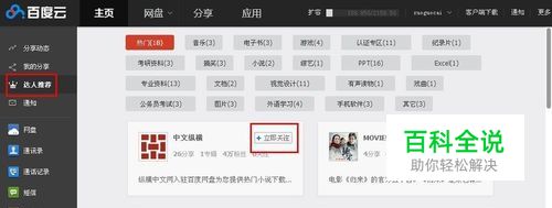 登录百度网盘,点击“主页“→”达人推荐“,找到感兴趣的好友,比如某个行业或兴趣领域的牛人,都是我们关注的对象,点击”立即关注“就好了。