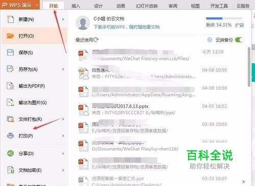 在打开的文件中,找到wps演示中的打印设置, 也可以用快捷键Ctrl+p