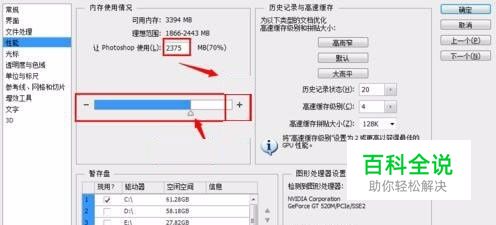 内存调节界面中可查看到“可用内存”大小,“PS可用大小”、暂存盘选取。 将允许PS使用的内存调大一些。