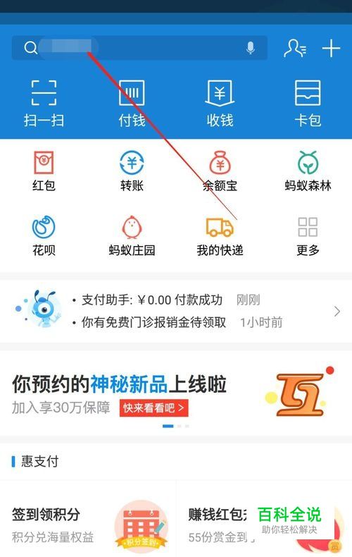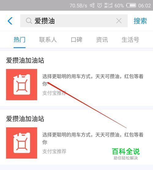如图打开支付宝,在支付宝首页上方搜索框输入“爱攒油”,然后如图点击“爱攒油加油站”。