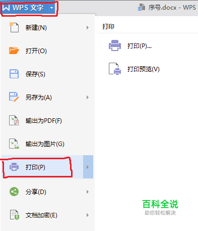点击最左上方“WPS”文字,这时弹出一个下拉菜单,在选择菜单中点击“打印”。也可以在键盘上输入快捷键“Ctrl+P”快速选择打印。如下图所示。