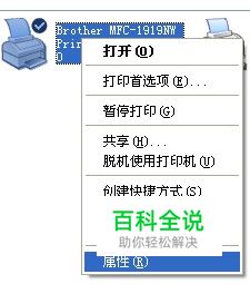 首先是获取打印机的参数,方法是,在已经安装好打印机的主机上,进入打印机管理页面,找到1919NW打印机,点击右键,选择“属性”