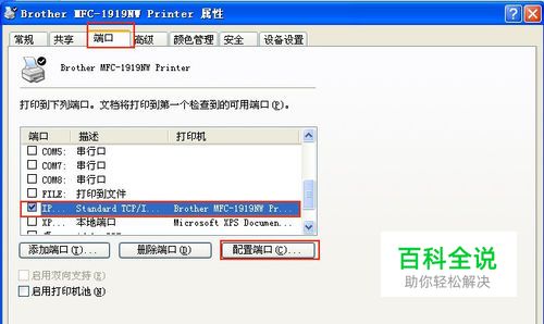 在弹出的属性窗口中,点击“端口”选项卡,然后你会看到下面蓝底并勾选中的哪个就是你打印机的端口,点击下面按钮“配置端口”