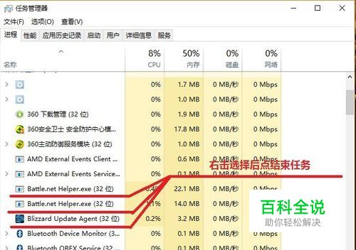 按 Ctrl+Alt+Delete调出任务管理器,找到 Battle.net相关进程选择后结 束任务。 (如果电脑开机后未运行过战网安装程序或客户端则可跳过此步)