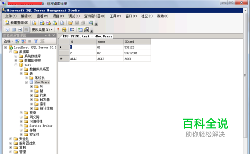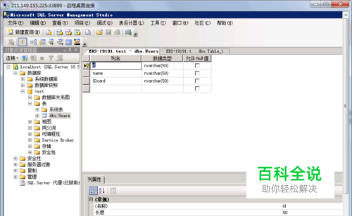 3、新建数据表 使用查询窗口,新建一张用户基本信息数据表: create table Users ( id int primary key identity(1,1), name nvarchar(20) not null, age int check(age>0), sex char(4) not null, telphone nvarchar(15), [address] nvarchar(100) ) 如图: