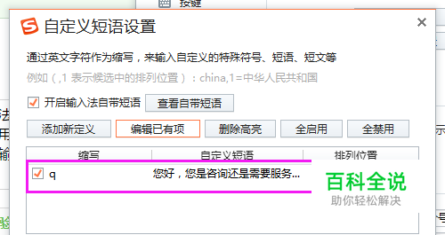 这样就可以了,就设置好了,我们使用搜狗输入法输入“q”的时候就有这个短语了,如图。