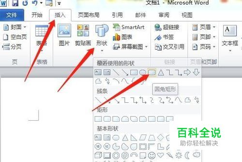 首先,打开Word软件,点击插入选项卡,点击形状功能,点击圆角矩形。