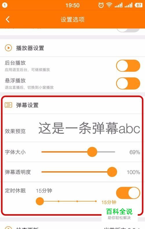 这时我们就可以来设置字体大小,弹幕透明度,定时休眠;设置后我们会立马看到效果,如图