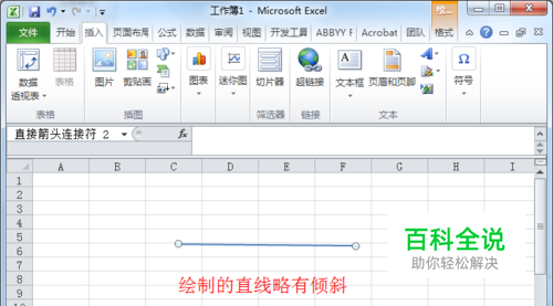 在Excel表格上面绘制一条直线,有时候会出现一点点倾斜(如下图所示)。下面就简单介绍一下倾斜直线的修改和绘制直线时不出现倾斜的方法。