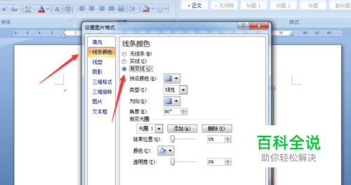 另一种方法设置边框是单击右键,然后选择“设置图片格式”,然后就会弹出对话框,在对话框中选择“线条颜色”,然后会有让你选择,假设选择的是“渐变线”,那么可以在下面设置,如图。