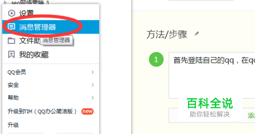 首先登陆自己的qq,在qq主面板左下角有三道横杠,点击它,在出来的菜单中选择消息管理器。当然也有其他渠道可以找到消息管理器,例如任意聊天窗口消息记录下拉菜单中也可以找到消息管理器。