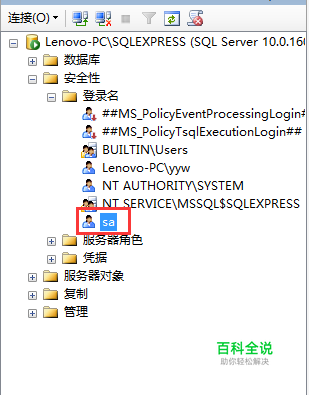 完成上述步骤之后,再次连接还是不能成功。这是因为初次使用登录名sa,此时sa还处于【禁用】状态。点开【安全性】【登录名】,找到登录名sa。