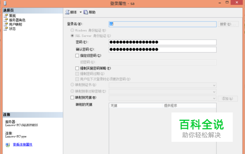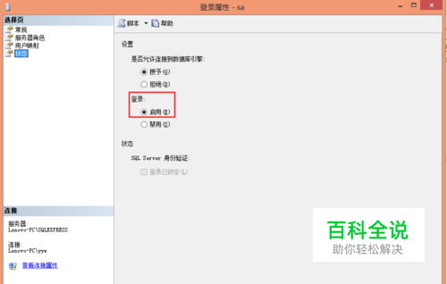 在【登录属性-sa】界面中,点击左侧选择页中的【状态】,然后在右侧出现的状态界面中将【登录】设置为【启用】,点击【确定】。先断开连接,然后再选择【SQL Server身份验证模式】进行连接,即可成功。
