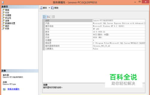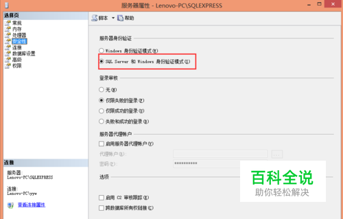 在建立的连接上右键单击,选择【属性】,进入【服务器属性】界面。在左侧选择页中点击【安全性】,然后在右侧安全性设置界面的【服务器身份验证】一栏中选择【SQL Server和Windows身份验证模式】,点击【确定】按钮。