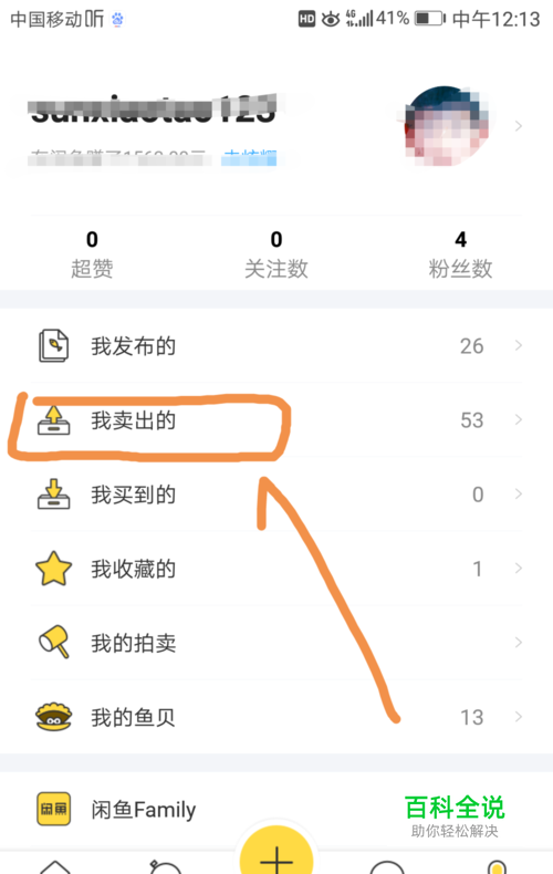进入闲鱼界面后点按箭头指向的我卖出的字样标志。
