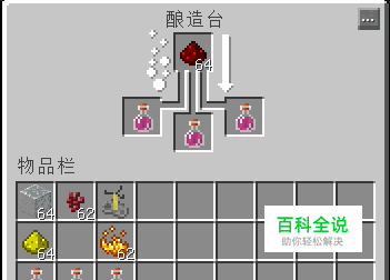 首先,我们需要准备的材料是:酿造台,玻璃(至少三个),地狱疣,烈焰粉,红石粉(制作持续时间延长版需要准备),萤石粉(制作力量加强版需要准备)。