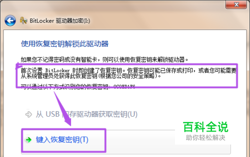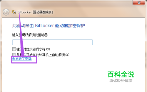 使用BitLocker加密了的U盘,当插入电脑打开的时候,需要输入密码,而忘记了密码,可以点击输入密码界面的“我忘记了密码”。