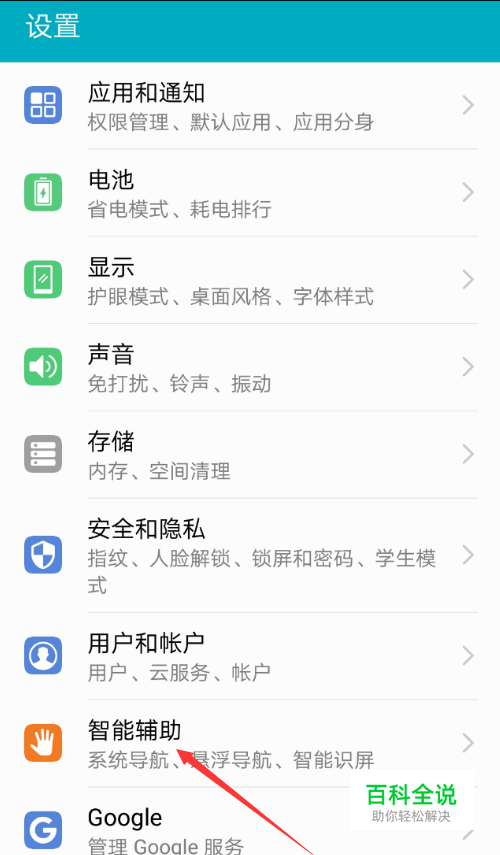 在设置列表中,找到“智能辅助”功能,点击进入;