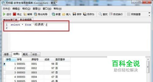 第一步在我们的电脑里面打开navicat,在建好的数据库和表中进行查询,输入: select * from `成绩表`;