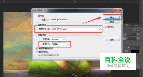 点开后,选择sRGB IEC61966-2.1。意图选择为“可感知”。点击确定。
