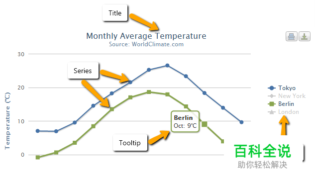 一般情况下,交互图表HighCharts包含Title-标题、Axis-轴、Series-数据系列、Tooltip-工具提示、Legend-图例等,每个部分对于位置如下图所示 :