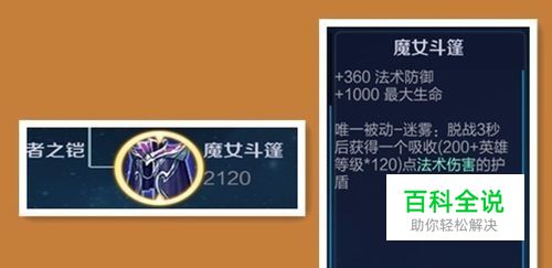 魔女斗篷 {【红玛瑙】(+300最大生命)→【力量腰带】(+1000最大生命值)+【抗魔披风】(+90法术防御)→【神隐斗篷】(+120法术防御;+700最大生命值;+50每5秒回血)}→【魔女斗篷】(+360法术防御;+1000最大生命;唯一被动-迷雾:脱离3秒后获得一个吸收(200+英雄等级*120)点法术伤害的护盾)。