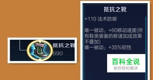 抵抗之靴 【神速之靴】(唯一被动:+30移动速度(所有鞋类装备的移速加成效果不叠加))→【抵抗之靴】(+110法术防御;唯一被动:+60移动速度(所有鞋类装备的移速加成效果不叠加);唯一被动:+35%韧性)。