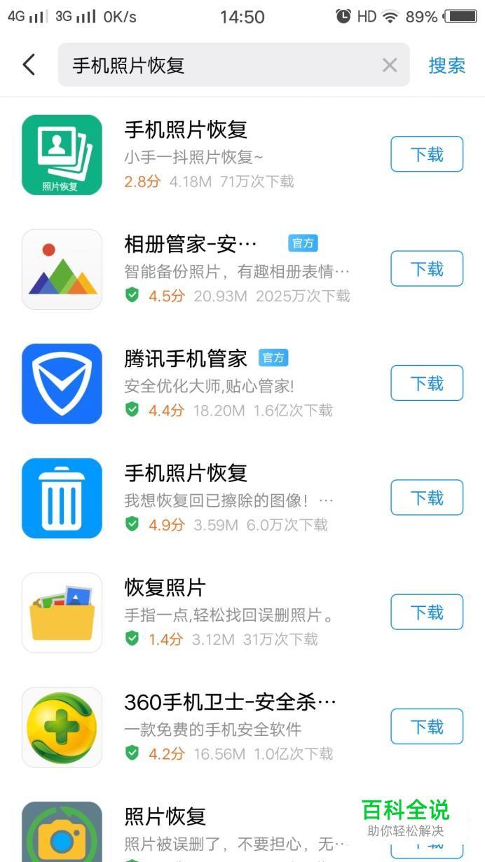 打开手机的应用商店,在搜索栏里输入“手机照片免费恢复”,搜索后可以看到有很多相关软件。