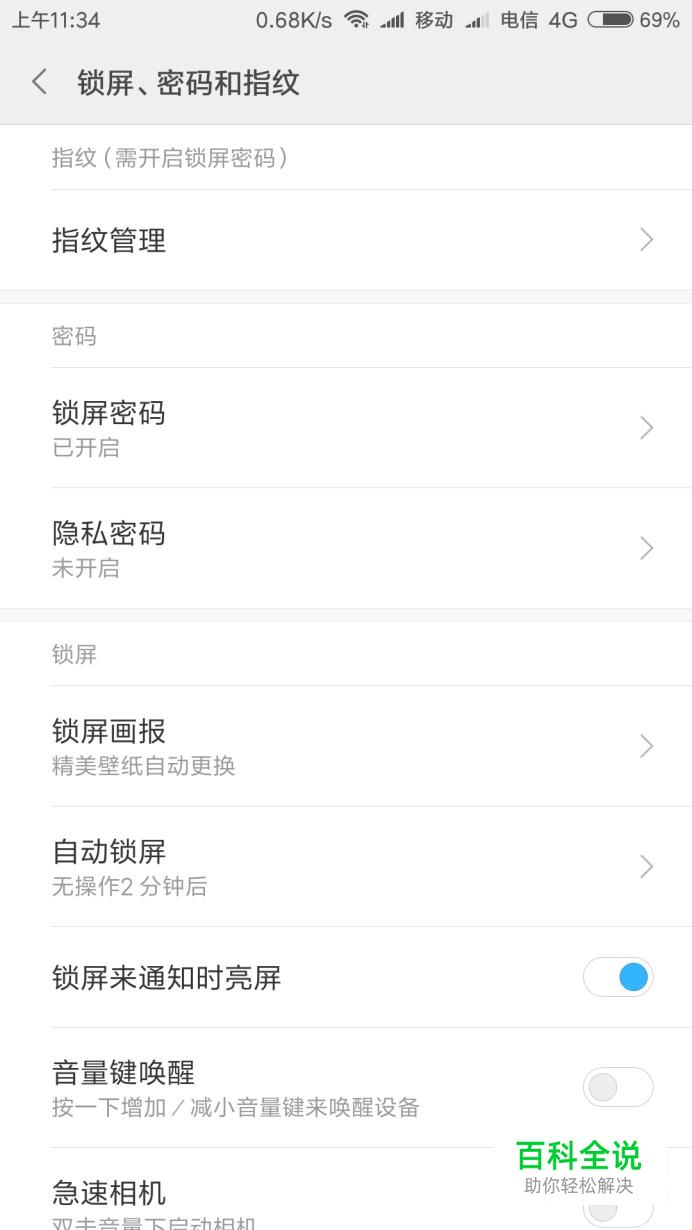 点击设置里的锁屏密码和指纹,进入到如图所示界面,有指纹添加和密码添加及管理功能。