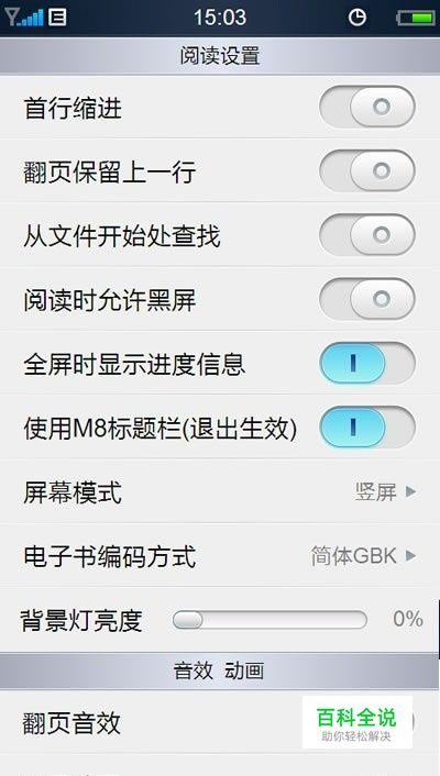 阅读设置:点击打开阅读设置窗口,可设置首行缩进、翻页时保留上一行、从文件开始处查找、阅读时允许黑屏、全屏时显示进度信息、使用M8标题栏、屏幕模式、电子书编码方式、背景灯亮度和开关翻页音效、调整翻页动画。点击”翻页动画“右侧分别在禁止动画、M8动画、翻书动画三种翻页动画中切换,点击”屏幕模式“右侧分别在竖屏、横屏、重力横屏三种屏幕模式中切换,重力横屏目前仅支持向右横屏;电子书编码方式可在简体GBK和繁体BIG5中切换;拖动背景灯亮度滚动条可调节阅读时背景灯亮度,退出软件时自动恢复系统原来的背景灯亮度。