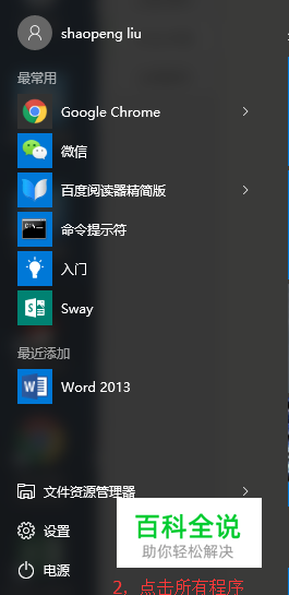 点击开始按钮,点击所有应用找到需要添加快捷方式的应用程序