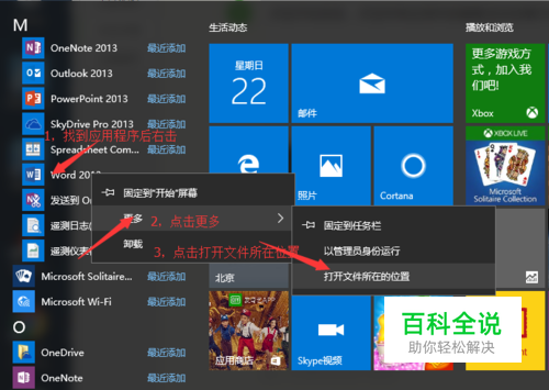 例如找到word,右击后点击更多,然后点击文件所在位置