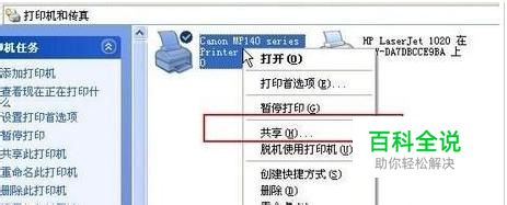 一:在带有打印机的电脑上,将打印机共享出去 1、首先,确认与共享打印机相连的处于开机状态,而且已经安装过打印机驱动程序,并且可实现正常打印,对于驱动安装在这里就不讲述了。(本次实际操作的的两台电脑使用的均为Windows XP专业版操作系统) 2、共享打印机实际操作。我们以佳能PIXMA MP145多功能一体机(隶属于Canon MP 140系列中的一款)为例说明,这是一款不具备网络功能的一体机,但是,通过连接一台电脑后,然后做相应的设置后能实现共享打印。 ① 在带有打印机的电脑上进行以下操作: 进入开始----直接找到打印机和传真,直接进入即可,如下图: