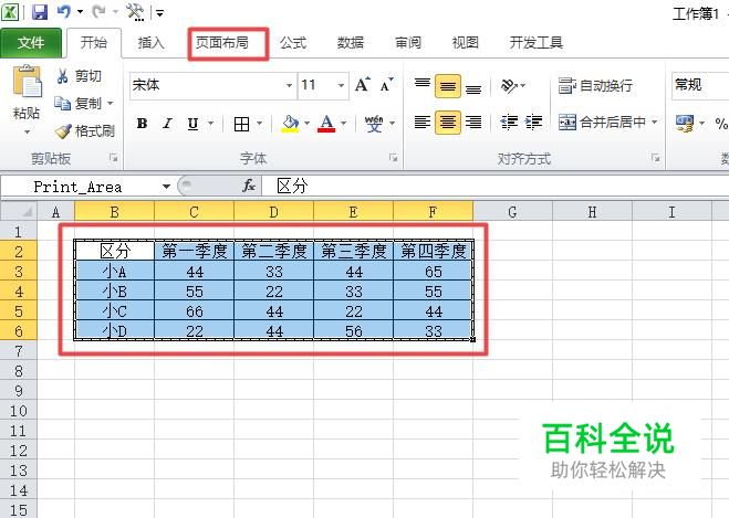 之后我们选中之前设置好的打印区域,然后我们点击工具栏中的页面布局;