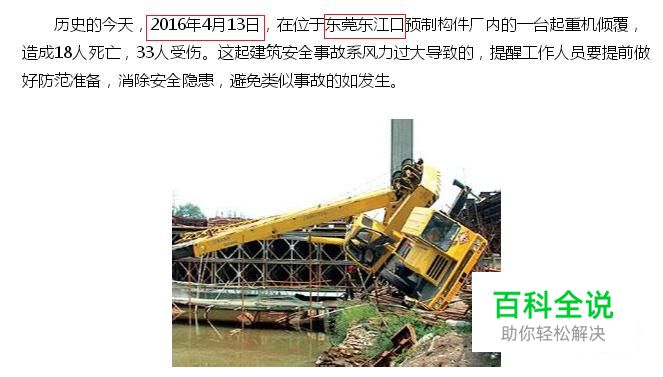 首先要确定事故发生日期与地点,因为事故调查报告是以事故发生日期和地点为标题,这样便于分别其他事故。我以东莞东江口起重机倾覆安全事故为例,事故发生日期和地点如下图: