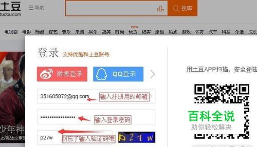 登录土豆网:如图所示依次输入邮箱、密码和验证码,点击登录。