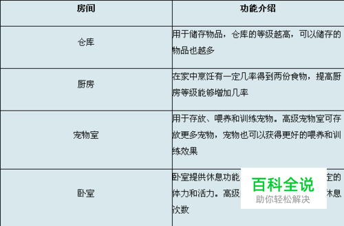 【空间划分】 房屋可以由玩家随意划分功能房间,房间包括仓库、卧室、厨房、宠物室、佣人房五种。每个房间分别有普通、中级、高级三个级别,高级的房间能更好地发挥该房间的功能。以下是五种房间的功能介绍: